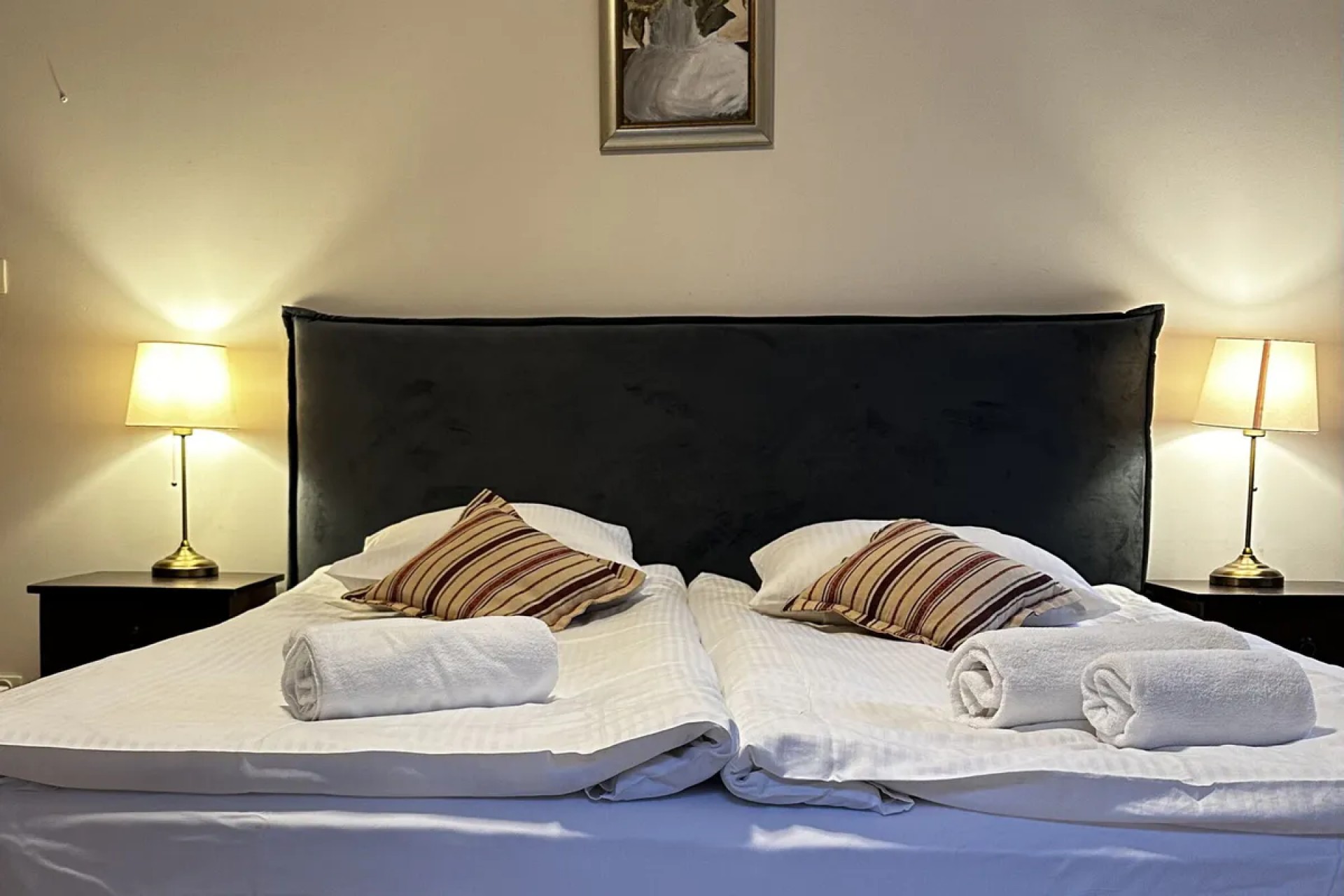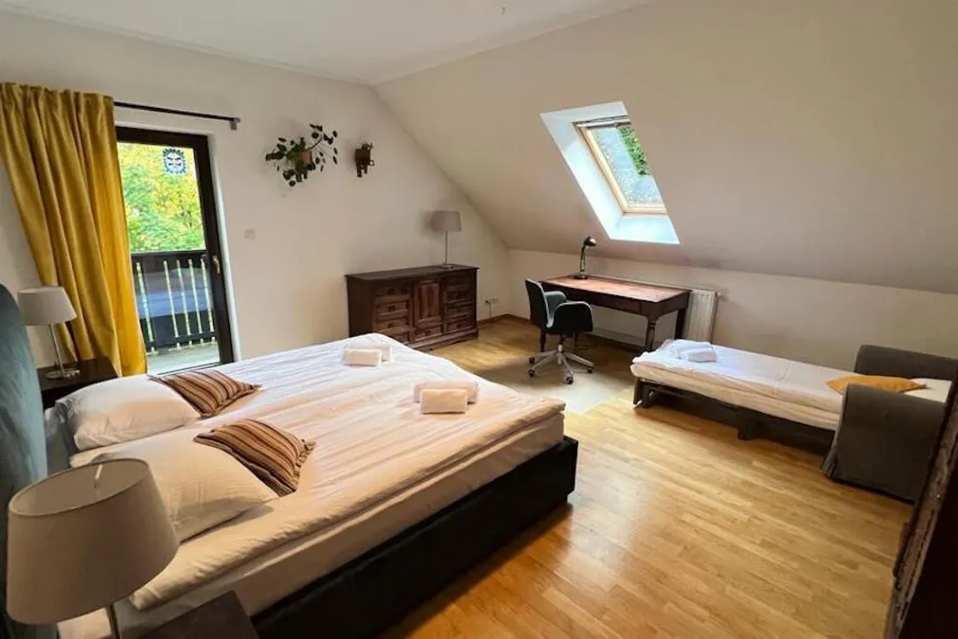W sypialniach znajdują się łóżka o wymiarach 180x200 cm (z możliwością rozdzielenia), a także dwie rozkładane sofy dziecięce. Zapewniono wysokiej jakości materace, pościel, ręczniki, biurka, komody i szafy.